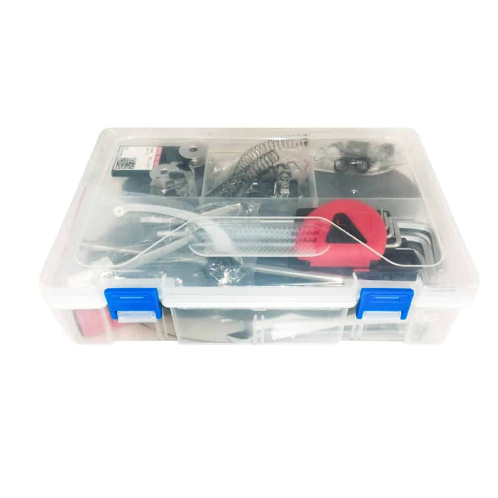 Set de Agujas, Bobinas, Crochet, Juego de llaves Alem, Pendrive, Portabobinas, llaves fijas, destornillador Phillips, destornillador plano, destornillador perillero, llave Z, pinza de punta, aceitera, barras agujas, tira hilos, pie de prénsatela, resortes de barra aguja, needle clamp (clamp para fijación de agujas), topes de regulación para barras agujas, resortes de módulo de tensión.